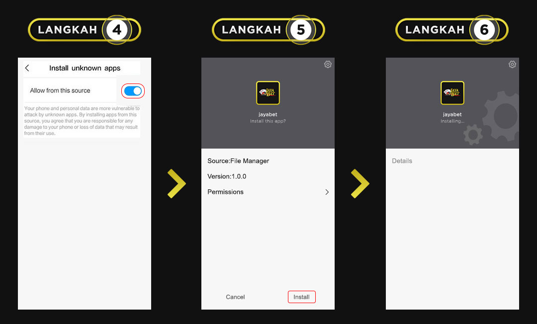 JIKA TIDAK DAPAT MELAKUKAN INSTALASI, MASUK KE SETTING > SECURITY DAN AKTIFKAN UNKNOWN SOURCES LALU KLIK INSTALL UNTUK MEMULAI PROSES INSTALASI.